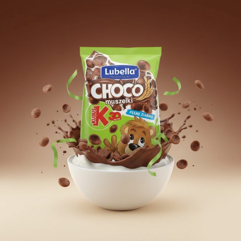 Démarrez la journée du bon pied avec les céréales Lubella Choco ! Riches en grains entiers (Pełne Ziarno) et intensément chocolatées, ces billes et coquillages croustillants apportent l'énergie et la gourmandise dont vos enfants ont besoin. Un classique du petit-déjeuner, sain, nutritif et sans compromis sur le goût.