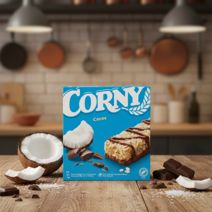 Pack de 6 barres de céréales Corny à la noix de coco et au chocolat au lait. Un snack croustillant et exotique pour une énergie gourmande. Poids total : 150g.