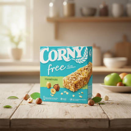 Pack de 6 barres de céréales Corny Free à la noisette. Une recette croustillante sans sucres ajoutés pour un plaisir léger et sain. Poids total : 120g.