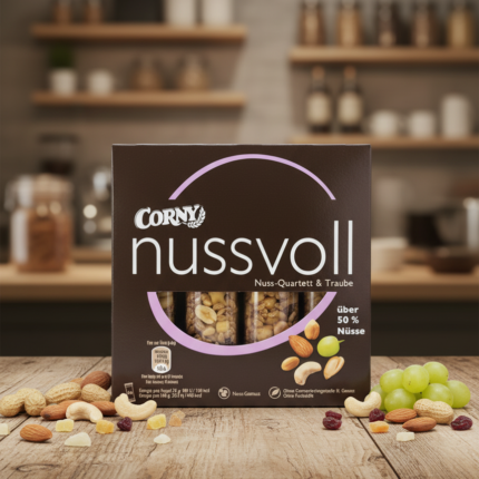 Pack de 4 barres premium Corny nussvoll. Un mélange riche de plus de 50% de noix (Quatuor : amandes, cajou, noisettes, cacahuètes) et de raisin fruité. Poids total : 96g.