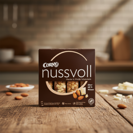 Pack de 4 barres premium Corny nussvoll. Une recette exquise contenant plus de 40% de noix (amandes) et des morceaux de chocolat blanc. Poids total : 96g.