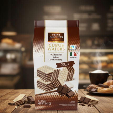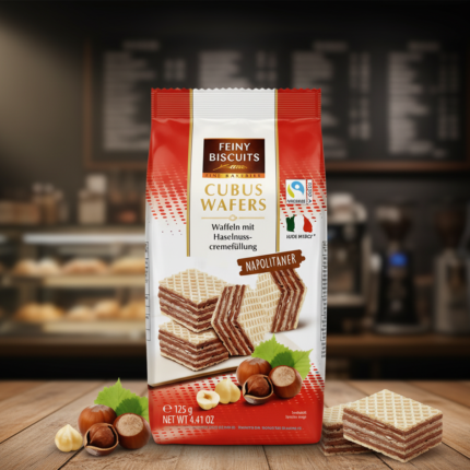 Sachet de 125g de gaufrettes cubes croustillantes fourrées à la crème cappuccino. Fabrication italienne de qualité avec ingrédients Fairtrade. Idéal avec le café.