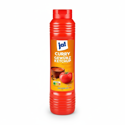 Bouteille familiale de 875ml de Ketchup au Curry et aux épices de la marque ja!. Une sauce tomate aromatique, idéale pour les barbecues, les saucisses et les frites.