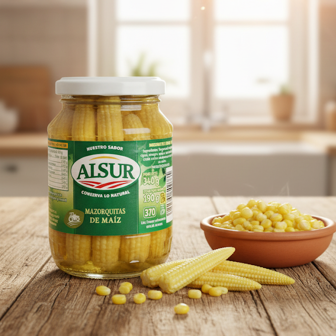 Découvrez l’authenticité des légumes en conserve avec les mini épis de maïs « Mazorquitas » d’Alsur. Récoltés jeunes pour garantir une texture tendre et un croquant irrésistible, ces mini maïs sont conservés dans une saumure légère qui préserve toute leur saveur naturelle.