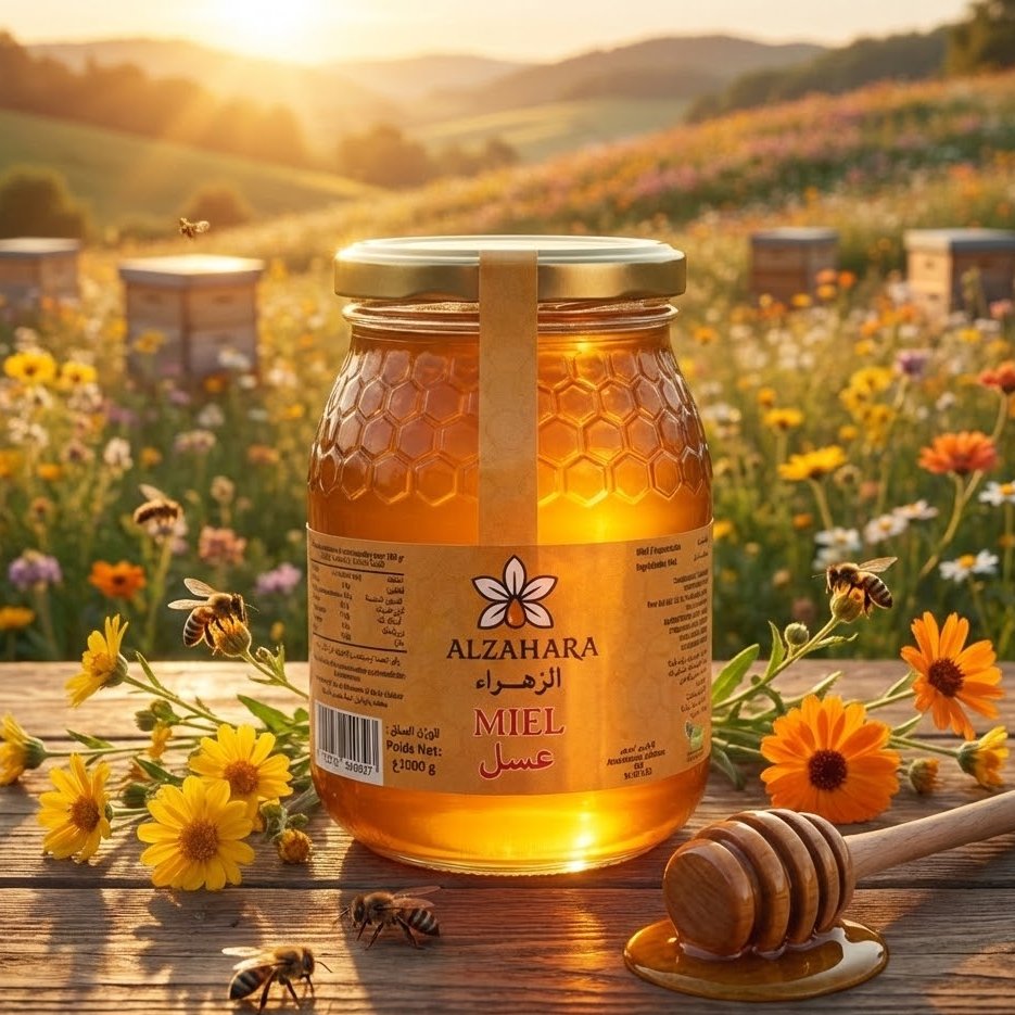 Profitez de la douceur naturelle avec le Miel Alzahara. Ce miel de fleurs (« Miel Multifleurs ») se distingue par sa couleur dorée ambrée et son goût riche et équilibré, issu d’une sélection rigoureuse de nectars. Présenté dans un superbe pot en verre texturé rappelant les alvéoles d’une ruche, ce miel est 100% pur (« Ingrédients : Miel »). Le format familial de 1kg est idéal pour une consommation quotidienne : parfait pour tartiner au petit-déjeuner, sucrer vos thés et tisanes, ou pour vos recettes de pâtisserie. Un produit de qualité, conditionné avec soin pour préserver tous ses arômes.