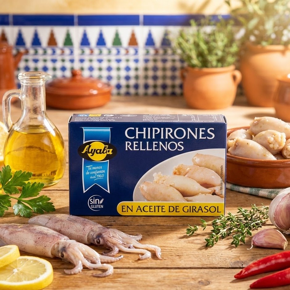 Conserve de petits calamars farcis (Chipirones) à l’huile de tournesol de la marque Ayala. Un classique des tapas espagnoles, tendre et savoureux. Sans Gluten. Poids : 72g.