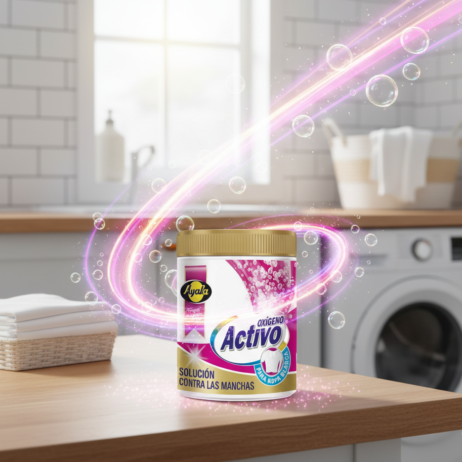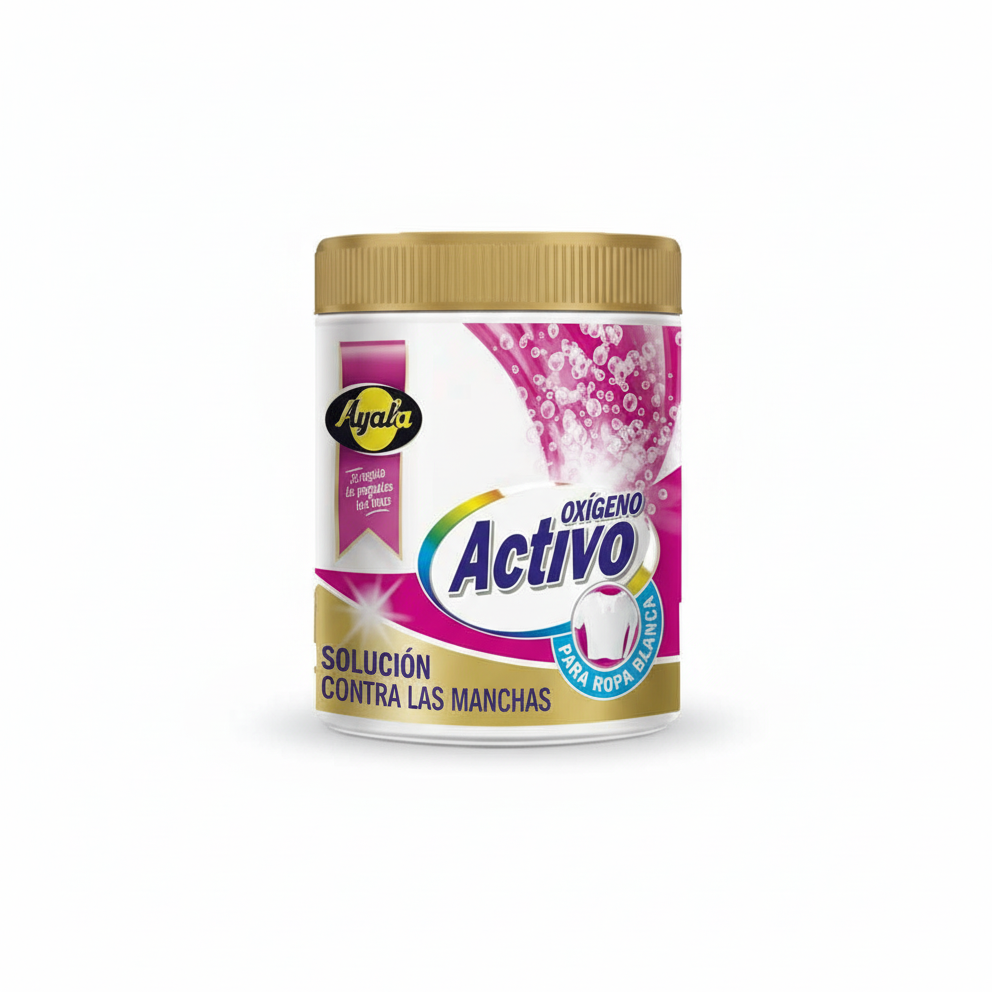 Ayala Oxígeno Activo est la « Solution Contre les Taches » ultime pour vos vêtements blancs. Sa formule puissante libère des bulles d’oxygène qui pénètrent au cœur des fibres pour désincruster les taches les plus difficiles (café, vin, herbe) sans abîmer le tissu. Spécialement conçu pour le linge blanc (« Para Ropa Blanca »), il élimine la grisaille et le jaunissement pour un résultat éblouissant.