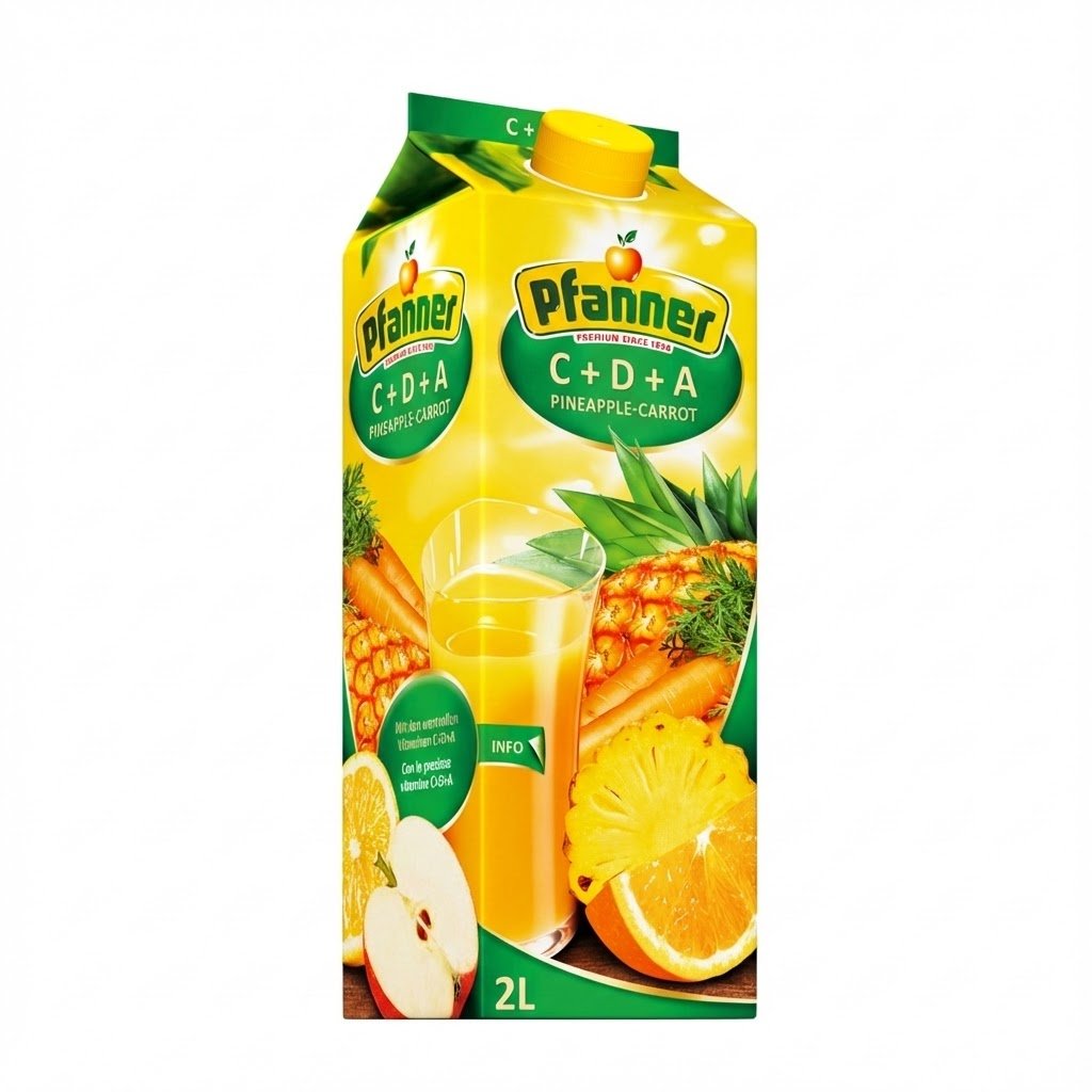 Brique de 2L de boisson Pfanner saveur Ananas et Carotte. Un cocktail délicieux enrichi en Vitamines C, D et A pour l’énergie et l’immunité.