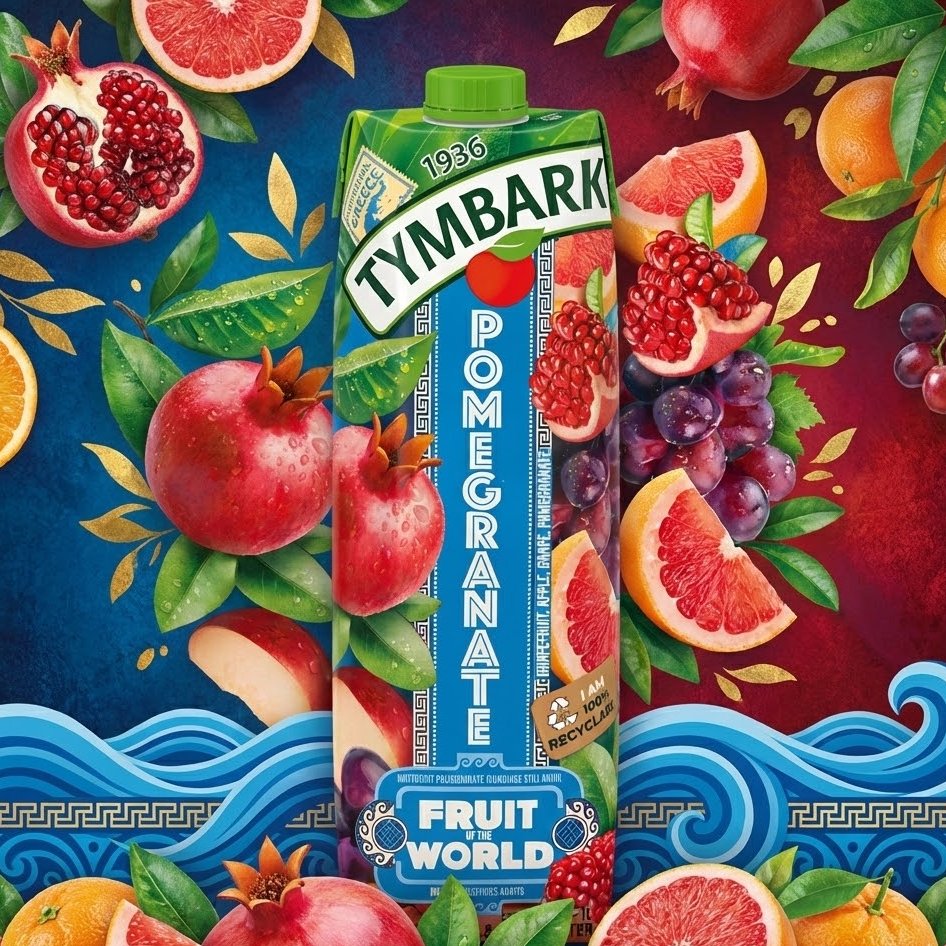 Brique de 1L de boisson Tymbark saveur Grenade (Pomegranate). Un mélange riche de grenade, pomme et raisin de la gamme « Fruit of the World », sans conservateurs.
