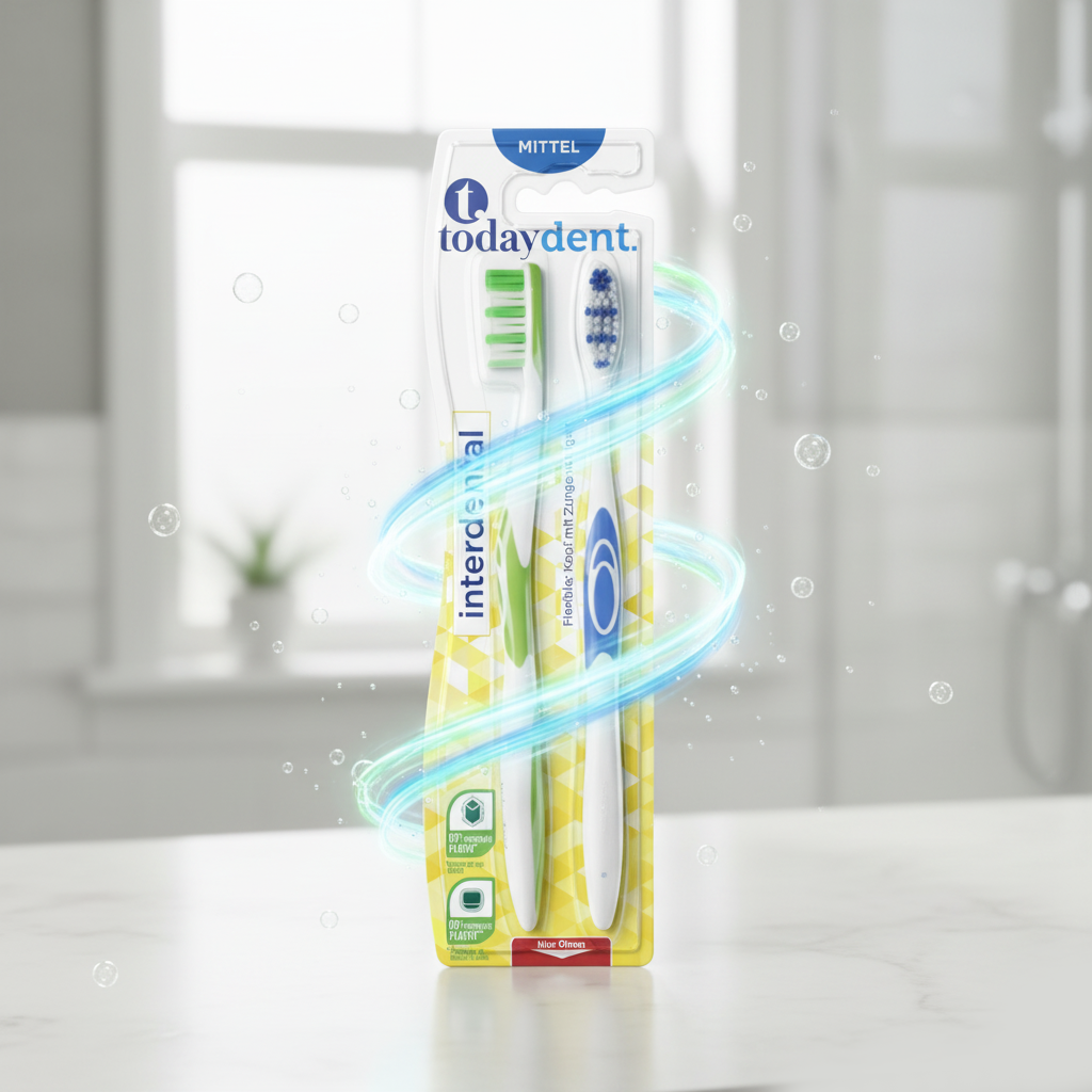 Les brosses à dents Todaydent « Interdental » sont conçues pour atteindre les zones difficiles d’accès. Leurs poils à hauteurs variables (profil interdentaire) nettoient efficacement les espaces entre les dents, là où la plaque s’accumule. Elles disposent d’une tête flexible (« Flexibler Kopf ») qui absorbe la pression pour protéger vos gencives, et d’un nettoyeur de langue au dos (« Zungenreiniger ») pour éliminer les bactéries responsables de la mauvaise haleine. Engagement Éco : Emballage respectueux de l’environnement avec 80% moins de papier et 30% de plastique recyclé.