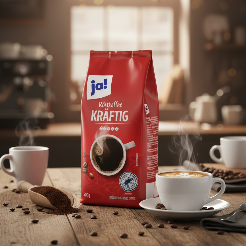Pour un réveil énergique, optez pour le café « ja! Röstkaffee Kräftig ». Comme son nom l’indique (« Kräftig » signifie puissant), ce café moulu offre un caractère corsé et intense. Il est idéal pour ceux qui recherchent un goût prononcé et une bonne dose de caféine pour bien démarrer la journée. Sa torréfaction soignée révèle des arômes riches et profonds. De plus, ce café est cultivé de manière durable, comme en témoigne la certification Rainforest Alliance. Le paquet sous vide de 500g garantit une fraîcheur optimale jusqu’à l’ouverture. Convient parfaitement aux cafetières filtres traditionnelles.