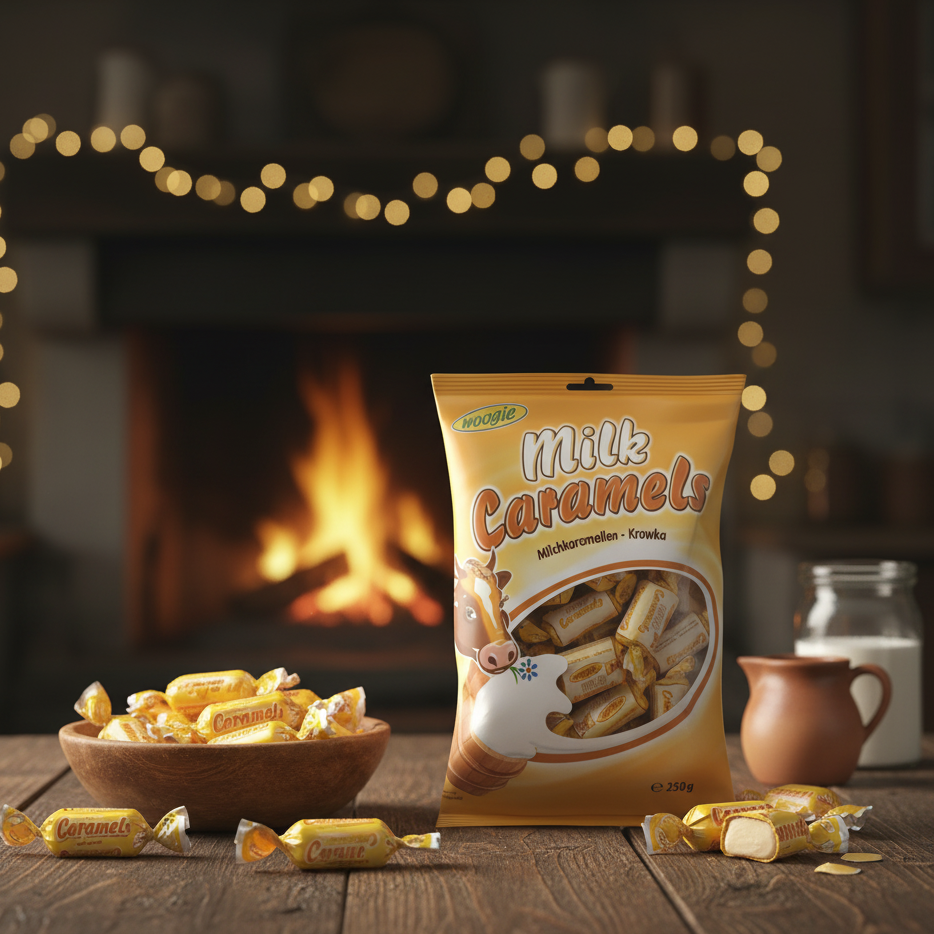 Tendres caramels au lait de type « Krowka » de la marque Woogie. Texture fondante et goût intense de crème. Sachet de 250g (bonbons emballés individuellement).