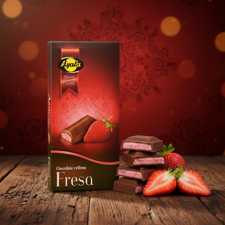 Laissez-vous surprendre par le Chocolat Ayala Fourré à la Fraise (« Fresa »). Cette tablette offre une expérience gustative unique : une coque de chocolat fin et croquant qui renferme un cœur fondant et crémeux au bon goût de fraise.