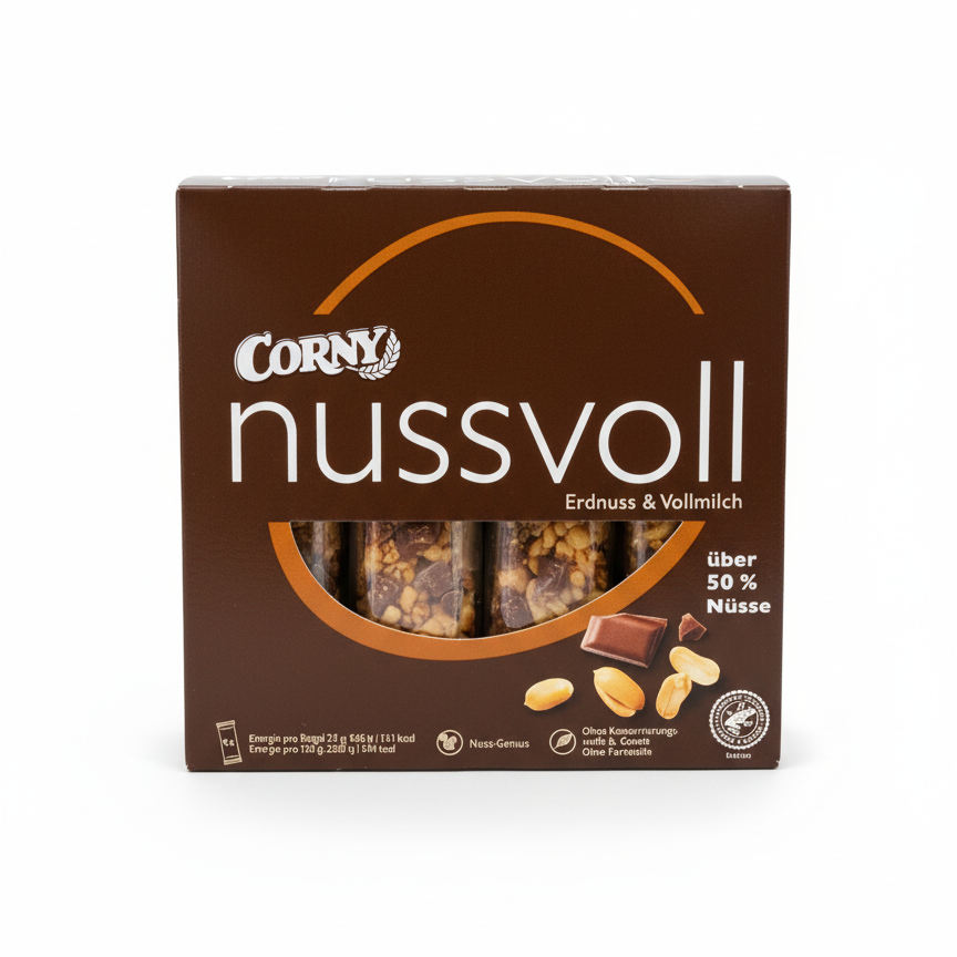 Pack de 4 barres premium Corny nussvoll. Une recette riche contenant plus de 50% de noix (cacahuètes) et des morceaux de chocolat au lait. Poids total : 96g.