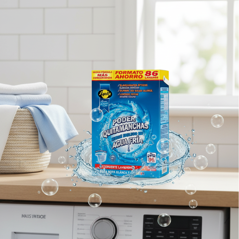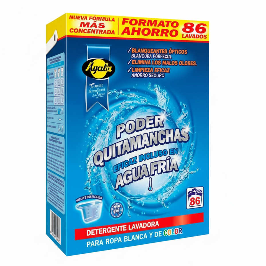 La lessive en poudre Ayala « Formato Ahorro » est conçue pour les gros volumes de linge. Sa nouvelle formule « Más Concentrada » (Plus Concentrée) intègre des agents blanchissants optiques (« Blanqueantes Ópticos ») pour une blancheur parfaite et un nettoyage en profondeur. Son « Pouvoir Détachant » agit efficacement même en eau froide (« Eficaz incluso en agua fría »), ce qui permet d’économiser de l’énergie tout en éliminant les taches tenaces et les mauvaises odeurs. Convient aussi bien pour le linge blanc que pour les couleurs (« Para Ropa Blanca y de Color »). Une dosette est incluse pour un dosage précis.