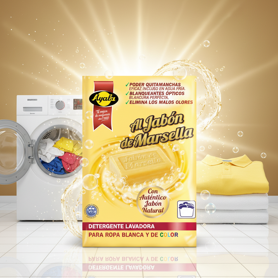 Voyez grand avec la lessive en poudre Ayala Marsella « Format Familial ». Ce paquet géant offre 86 lavages (environ 6,88 kg) de pure efficacité. Sa formule est enrichie « Con Auténtico Jabón Natural » (au véritable Savon Naturel) pour nettoyer les fibres en douceur tout en étant impitoyable contre les taches grâce à son « Poder Quitamanchas ». Elle contient des agents blanchissants optiques (« Blanqueantes Ópticos ») pour un blanc éclatant et élimine efficacement les mauvaises odeurs. Efficace même en eau froide, elle est parfaite pour le linge blanc et coloré de toute la famille.