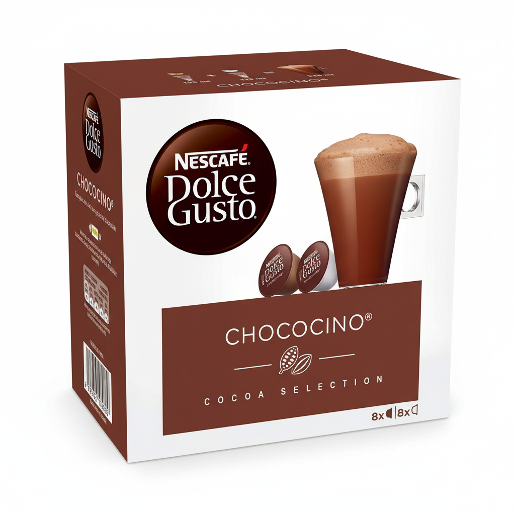 Boîte de 16 capsules (8 lait + 8 cacao) pour préparer 8 tasses de Chococino. Un chocolat chaud riche et onctueux avec une mousse généreuse, signé NESCAFÉ Dolce Gusto.