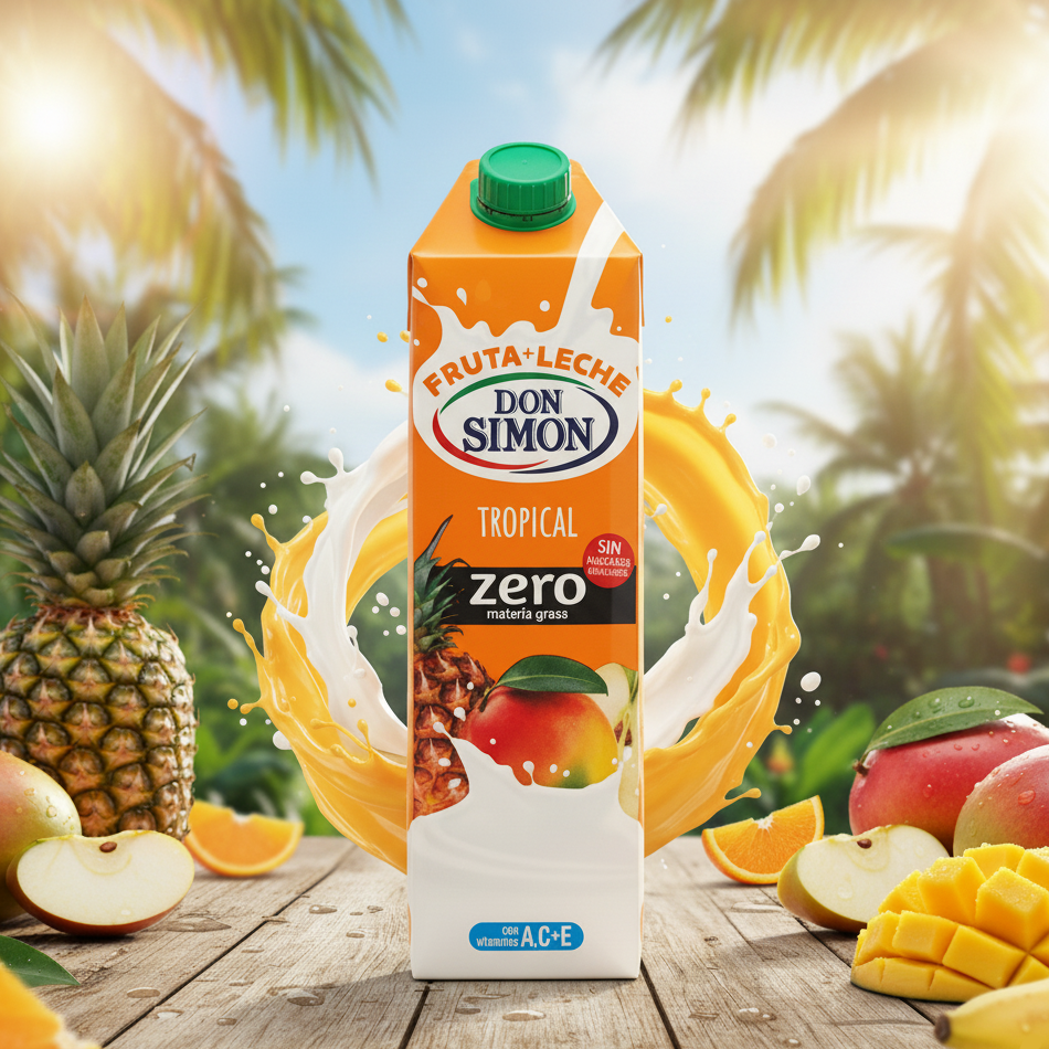 Brique de 1L de boisson lactée Don Simon Zero. Saveur Tropicale (Ananas, Mangue), formule 0% matière grasse, sans sucres ajoutés et riche en vitamines.