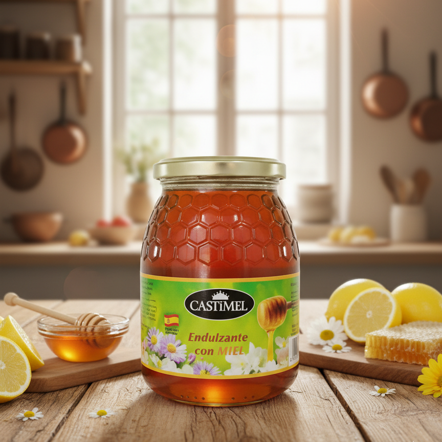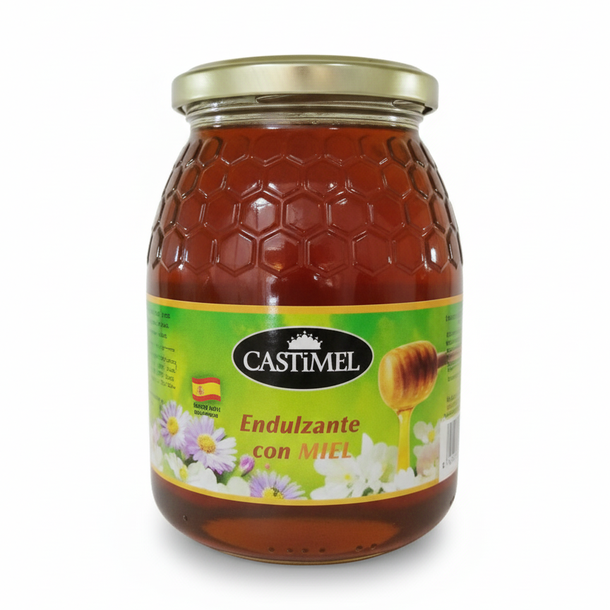 Bocal en verre de 1 kg de préparation sucrante au miel Castimel. Design élégant avec gravure alvéolée. Produit d’origine espagnole, idéal pour sucrer et napper au quotidien.