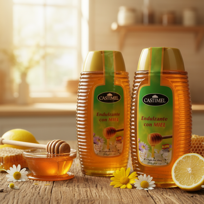 Flacon souple de 350g d’édulcorant au miel Castimel. Format « Squeeze » pratique et propre pour un dosage facile. Idéal pour le petit-déjeuner. Produit espagnol sans gluten.