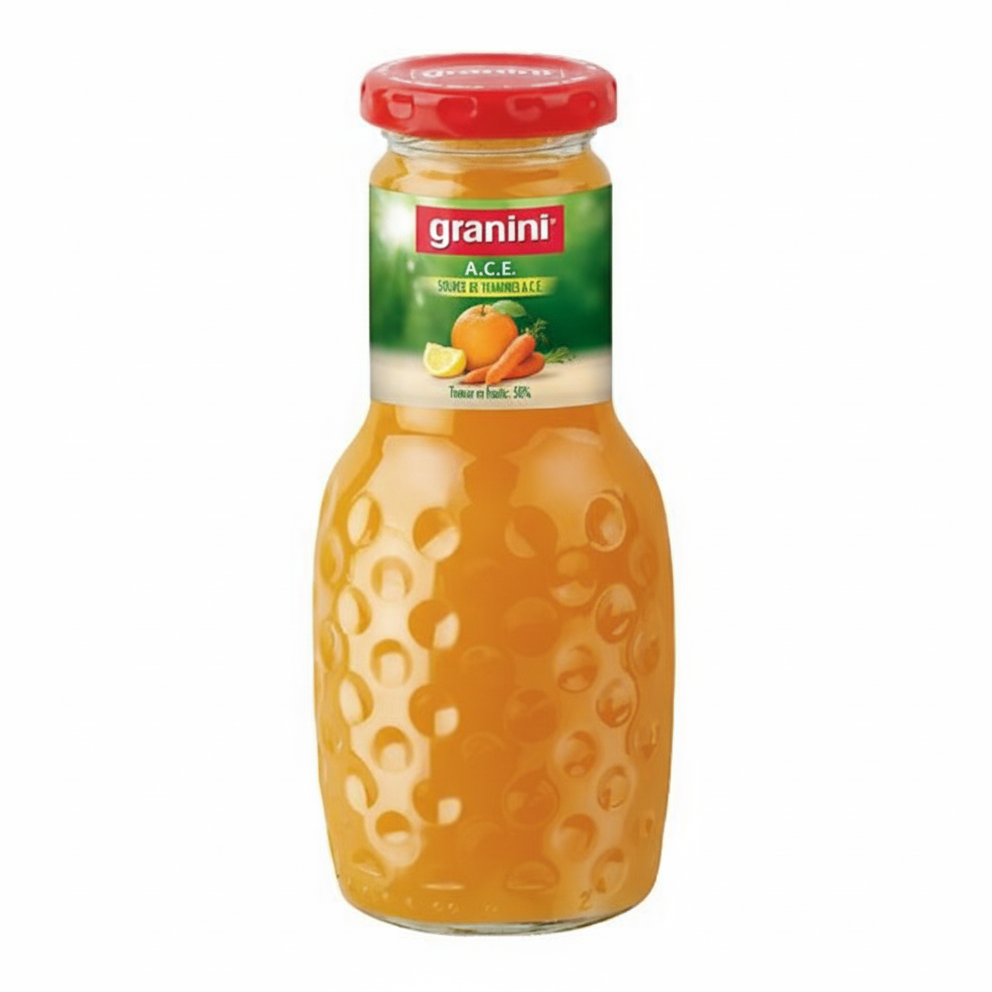 Bouteille en verre de 250ml de Granini A.C.E. Un cocktail vitaminé d’Orange, Carotte et Citron (58% de fruits), source de Vitamines A, C et E.