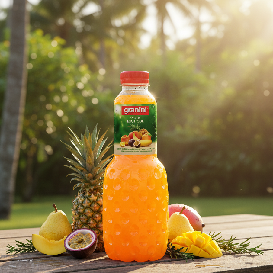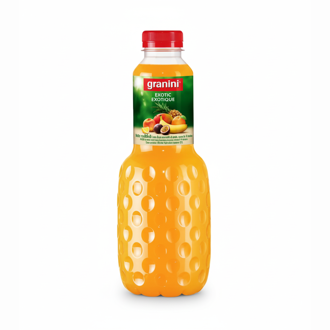 Bouteille iconique de 1L de Granini Exotique. Un cocktail riche et onctueux de fruits tropicaux (Ananas, Mangue, Passion, Banane), idéal pur ou en cocktail.