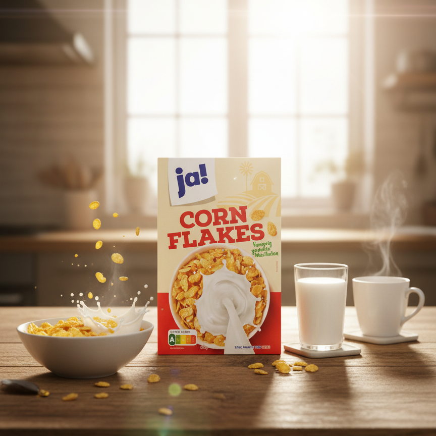 ja! Cornflakes 500g – Le Plaisir Croustillant au Quotidien (500g) Commencez votre journée avec énergie grâce aux Cornflakes ja!. Des pétales de maïs dorés, soigneusement grillés pour une texture ultra-croustillante. Simple, naturel et délicieux, c’est le petit-déjeuner classique par excellence pour toute la famille.