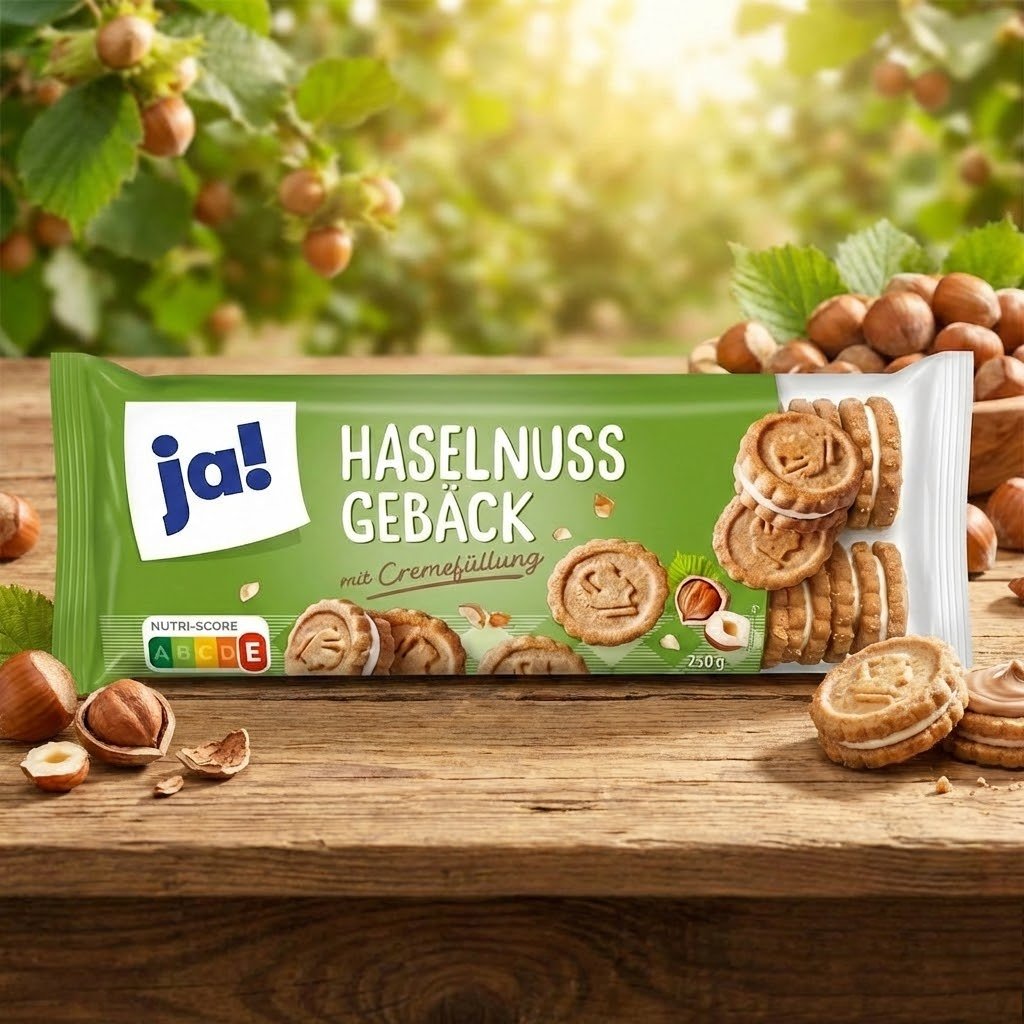 Offrez-vous une pause douceur avec les Haselnuss Gebäck de la marque ja!. Ces délicieux biscuits de type « sandwich » se composent de deux sablés croustillants au bon goût de noisette, unis par une généreuse couche de crème blanche onctueuse (« mit Cremefüllung »). Leur texture croquante et leur cœur fondant en font le compagnon idéal pour le thé ou le café. Chaque biscuit est décoré d’un motif amusant, ajoutant une touche de plaisir visuel à la dégustation. Le paquet de 250g offre une quantité généreuse à petit prix, parfait pour les goûters en famille ou les petites faims au bureau.