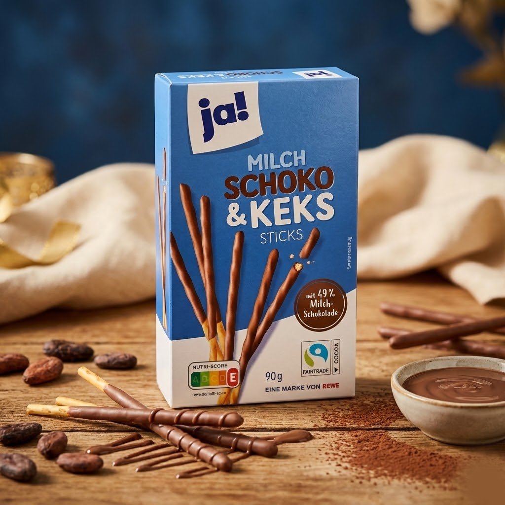 Pour ceux qui préfèrent la douceur au corsé, voici les « Ja! Milch Schoko Sticks ». Contrairement à la version noire, ces bâtonnets sont généreusement nappés de « 49% Milch-Schokolade » (Chocolat au lait). L’association du biscuit sec et du chocolat au lait fondant crée une harmonie parfaite en bouche. Présentés dans une boîte bleue reconnaissable, ils sont parfaits pour les pauses café ou le goûter des enfants. Cacao certifié Fairtrade.