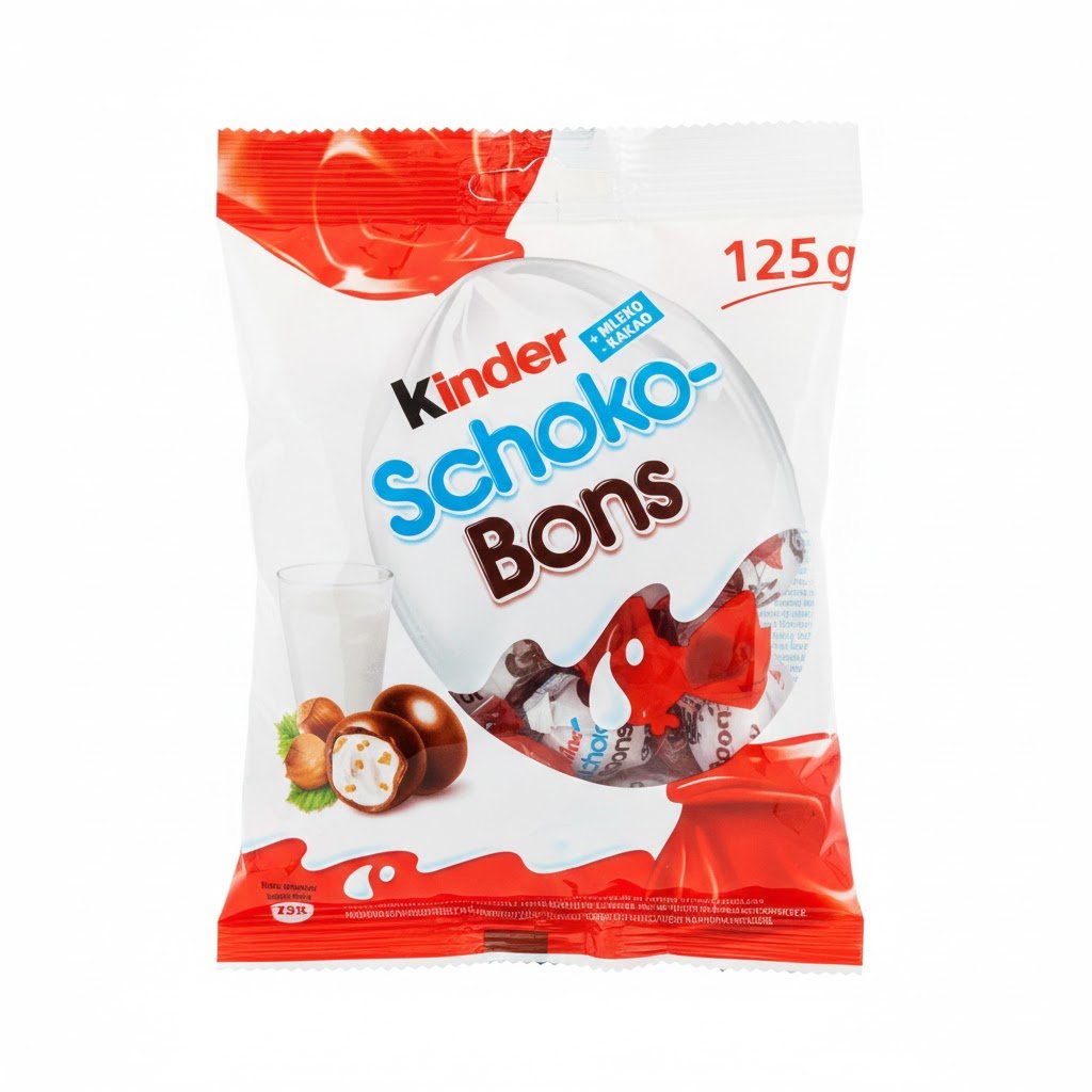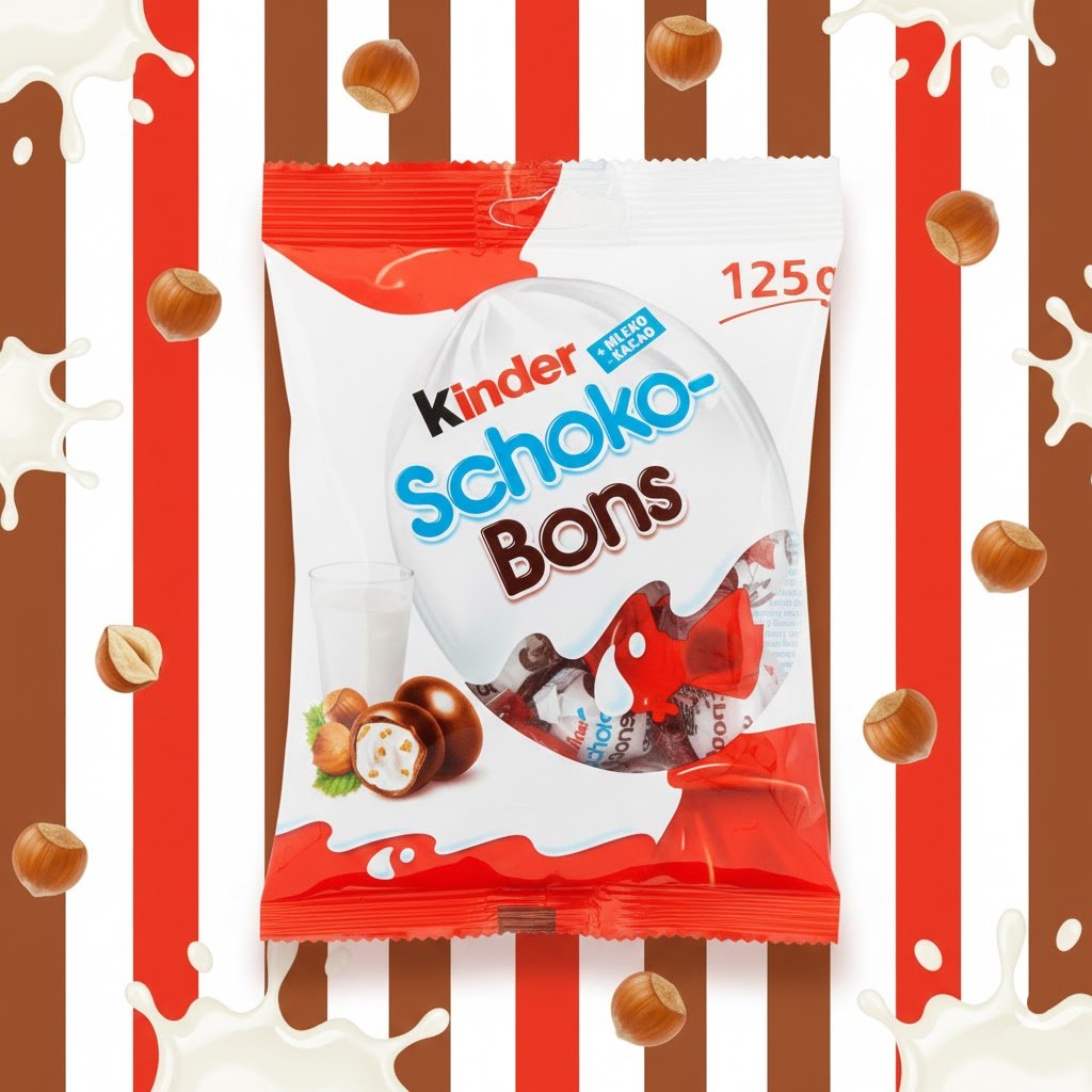 Sachet de Kinder Schoko-Bons. Délicieux bonbons de chocolat au lait fourrés d’une crème au lait onctueuse et d’éclats de noisettes. Emballés individuellement. Poids : 125g.