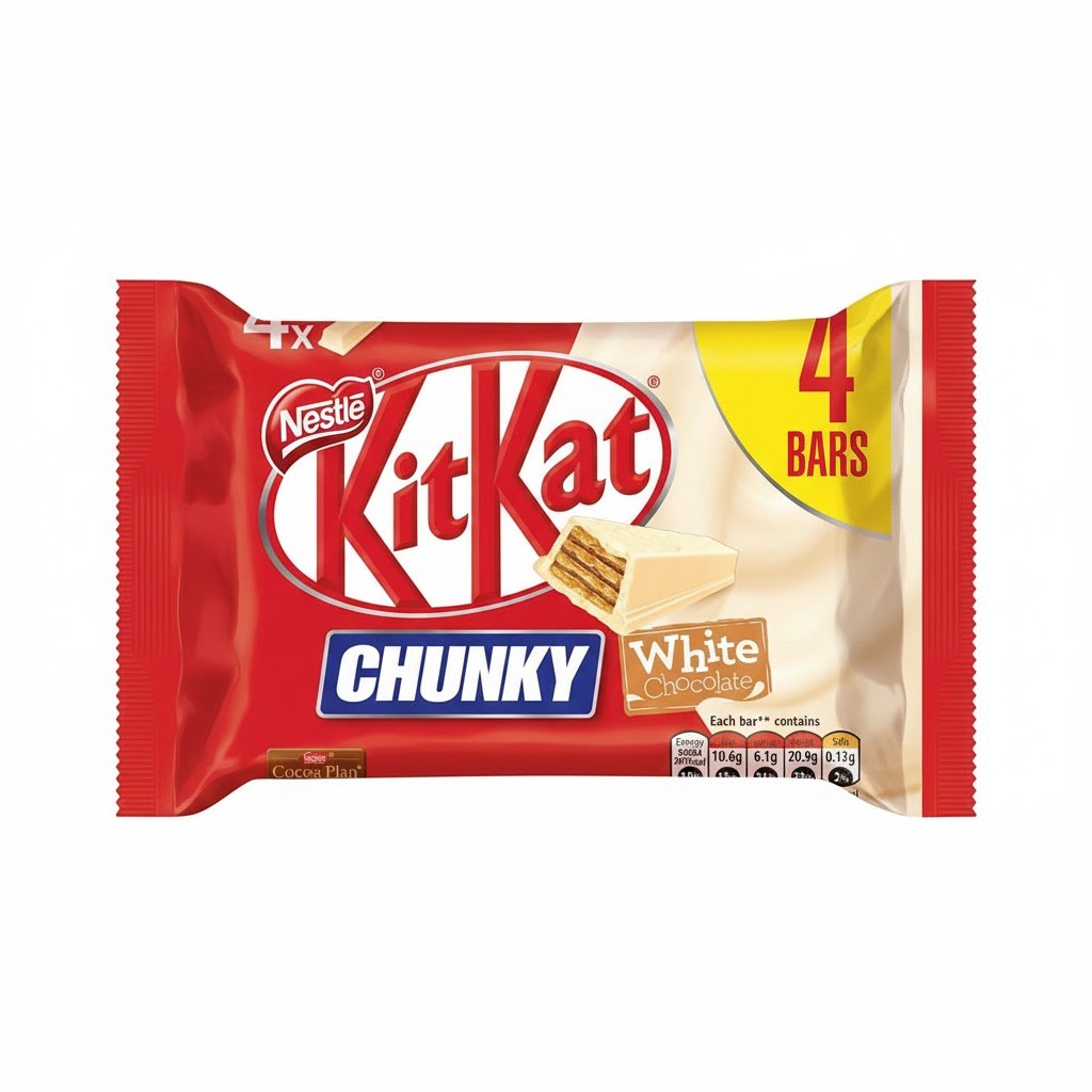 Pack de 4 barres KitKat Chunky version White. Gaufrette épaisse et croustillante enrobée d’un délicieux chocolat blanc crémeux. Cacao durable. Poids total : 160g.