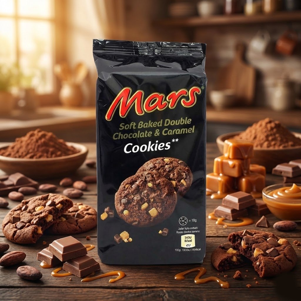 Vivez une expérience de douceur absolue avec les Mars Soft Baked Cookies. Contrairement aux biscuits classiques, ces cookies sont cuits pour rester tendre et moelleux (« Soft Baked ») à l’intérieur. Leur pâte riche au double chocolat (« Double Chocolate ») est généreusement garnie de pépites de caramel tendre et de morceaux de chocolat, recréant le goût iconique de la barre Mars dans un format cookie décadent. Chaque bouchée offre une texture fondante et une richesse aromatique intense. Le paquet de 162g contient généralement 8 cookies, parfaits pour être réchauffés quelques secondes au micro-ondes pour un effet « tout juste sorti du four » encore plus gourmand.