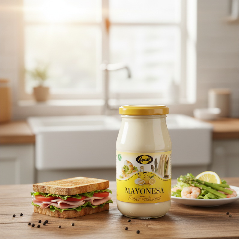 Pour les amateurs de traditions, Ayala propose sa célèbre mayonnaise « Sabor Tradicional » en bocal de verre. Retrouvez cette recette espagnole unique, caractérisée par une texture ferme et crémeuse et un goût équilibré qui relève parfaitement vos plats sans les alourdir.