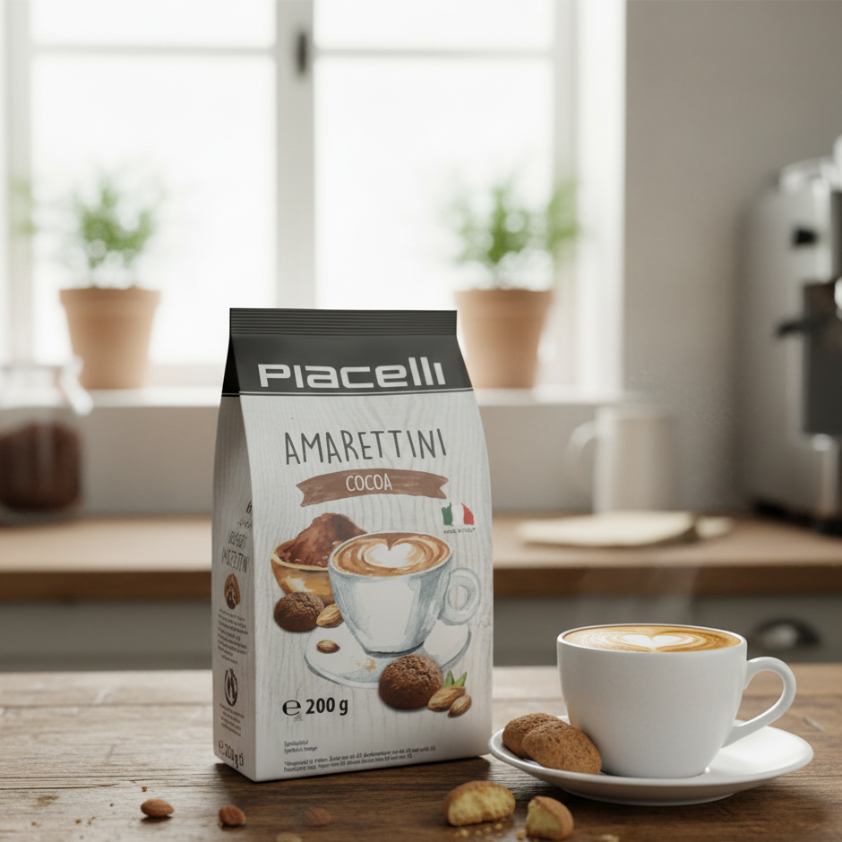 Petits plaisirs italiens ! Amarettini croustillants au Cacao de la marque Piacelli. De petits biscuits aux amandes et au cacao, certifiés « Made in Italy ». Parfaits avec un cappuccino ou en décoration de desserts. Paquet de 200g.
