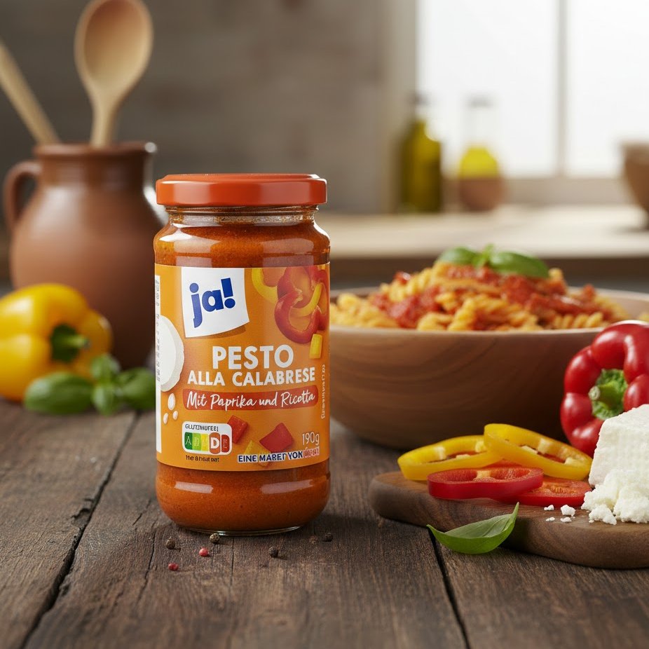 Le Pesto alla Calabrese de la marque ja! est une spécialité italienne gourmande qui mise sur la douceur des poivrons et l’onctuosité de la ricotta. Contrairement au pesto vert classique, cette version « rouge » offre une texture riche et un goût légèrement sucré et épicé qui ravira les amateurs de saveurs méditerranéennes.