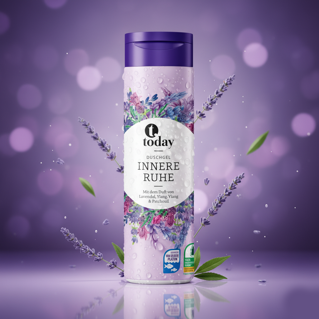 Un pur moment de détente. Gel douche « Today Innere Ruhe » (Paix Intérieure) aux huiles essentielles de Lavande, Ylang-Ylang et Patchouli. Idéal pour se relaxer. Formule sans microplastiques.