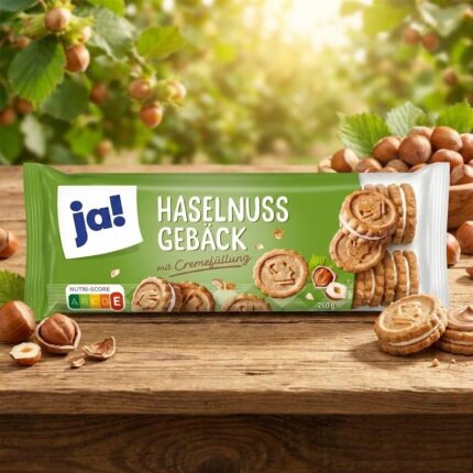 Le snack parfait ! Barres chocolatées "Knusper Riegel" de la marque Ja!. Un mélange irrésistible de crème de lait onctueuse et d'éclats de noisettes croustillants, enrobés de chocolat au lait. Paquet de 5 barres (200g).