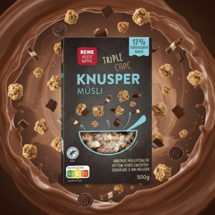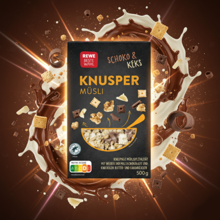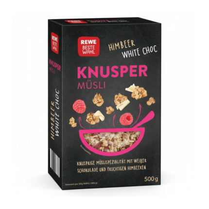 Offrez-vous un petit-déjeuner gourmand avec le Knusper Müsli REWE Beste Wahl. Un mélange parfait de pépites de céréales croustillantes, agrémenté de copeaux de chocolat blanc fondant et de délicieux morceaux de framboises fruitées. Un équilibre irrésistible entre croquant et douceur pour bien commencer la journée !