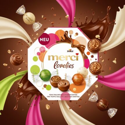 Boîte de 185g de pralines Merci Lovelies Creamy. Un assortiment de 4 variétés de boules chocolatées aux fourrages crémeux et fondants. Idéal pour les amateurs de douceur.