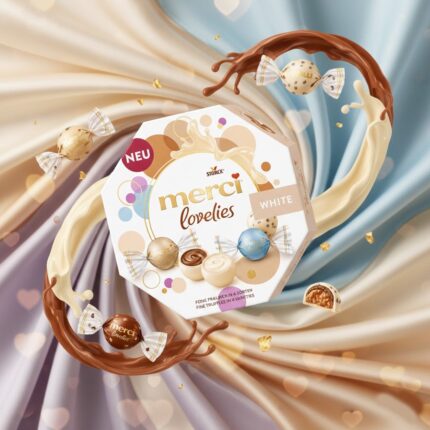 MERCI Lovelies White 185gx7 : Découvrez l'élégance du chocolat merci Coffee & Cream. Une fusion parfaite entre un chocolat blanc onctueux à la crème et un chocolat au lait riche aromatisé au café. Présenté en 4 tablettes individuelles, c'est le plaisir idéal pour accompagner votre pause café ou pour offrir un petit moment de douceur.