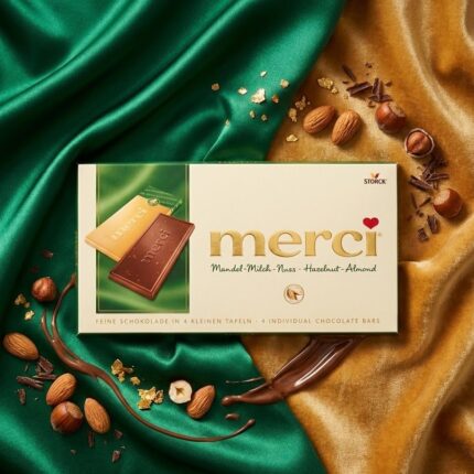 Merci Schokolade Hazelnut & Almond 100gx15 : L'élégance du chocolat aux éclats de noisettes et d'amandes. Succombez au plaisir raffiné de la tablette Merci Hazelnut & Almond. Un chocolat au lait extra-fin et onctueux, généreusement garni de morceaux croquants de noisettes et d'amandes sélectionnées. Le coffret contient 4 petites tablettes emballées individuellement, idéales pour une pause gourmande ou pour offrir un petit moment de bonheur. Un classique de la maison Storck pour les amoureux de textures contrastées.